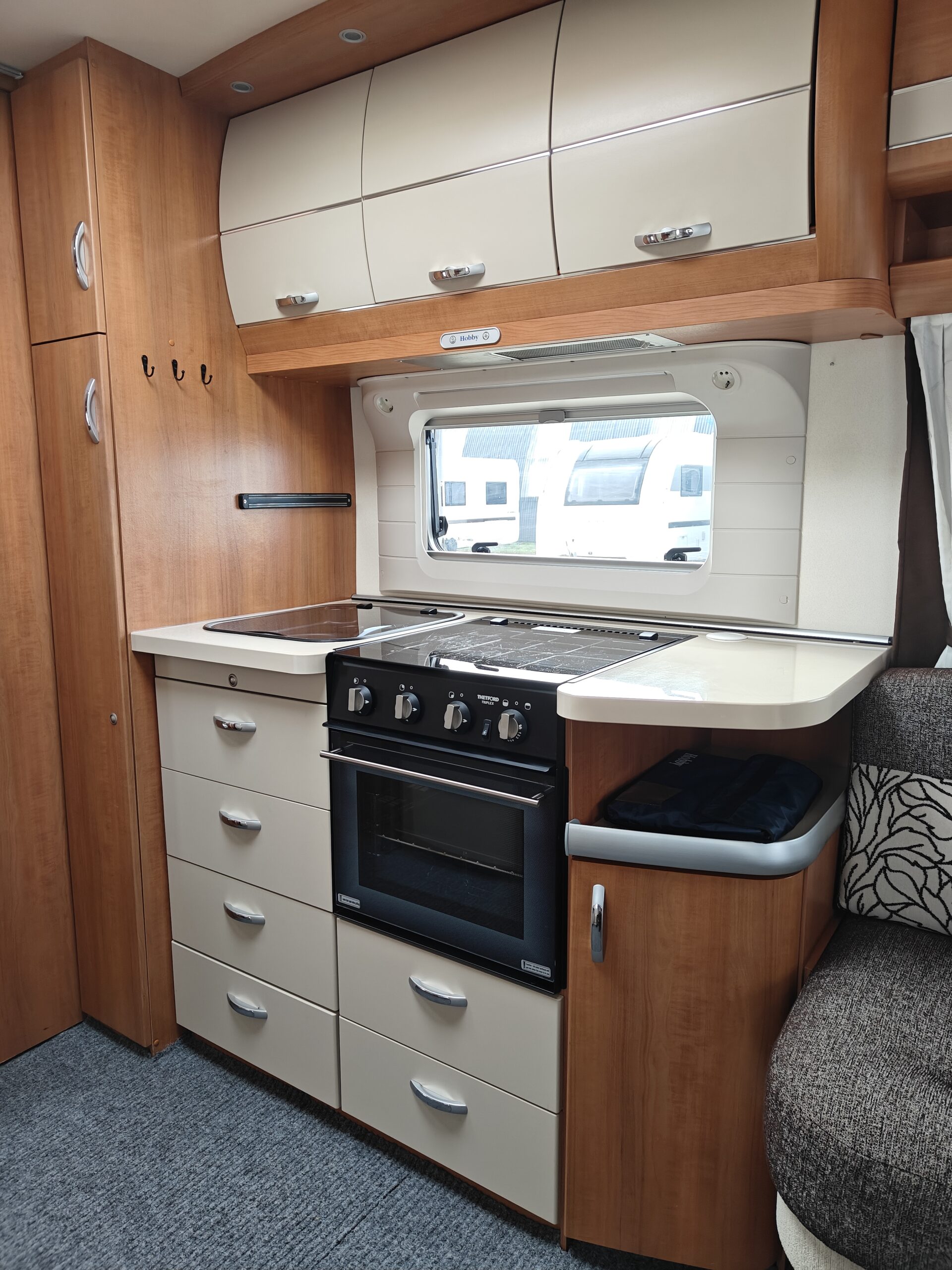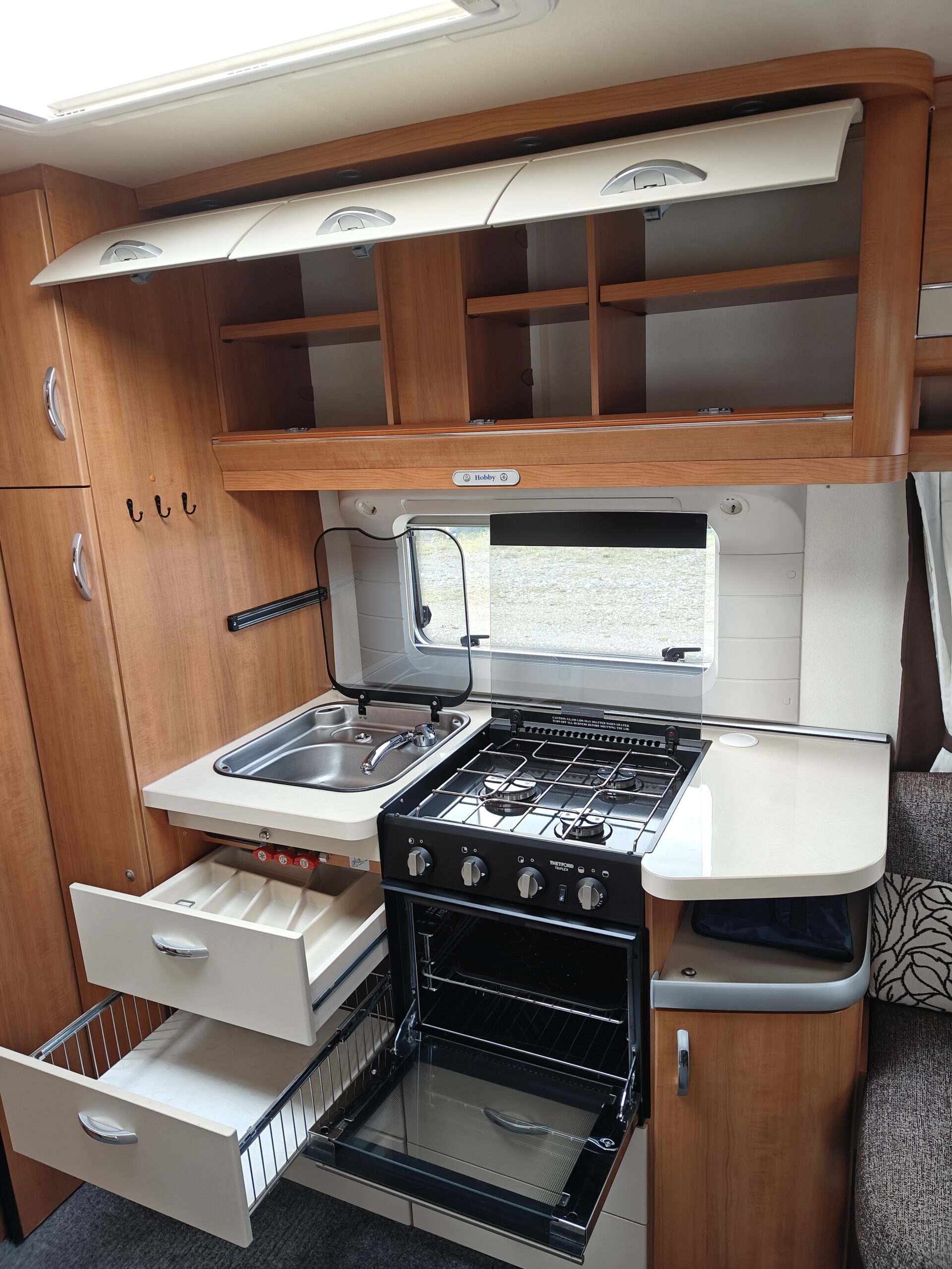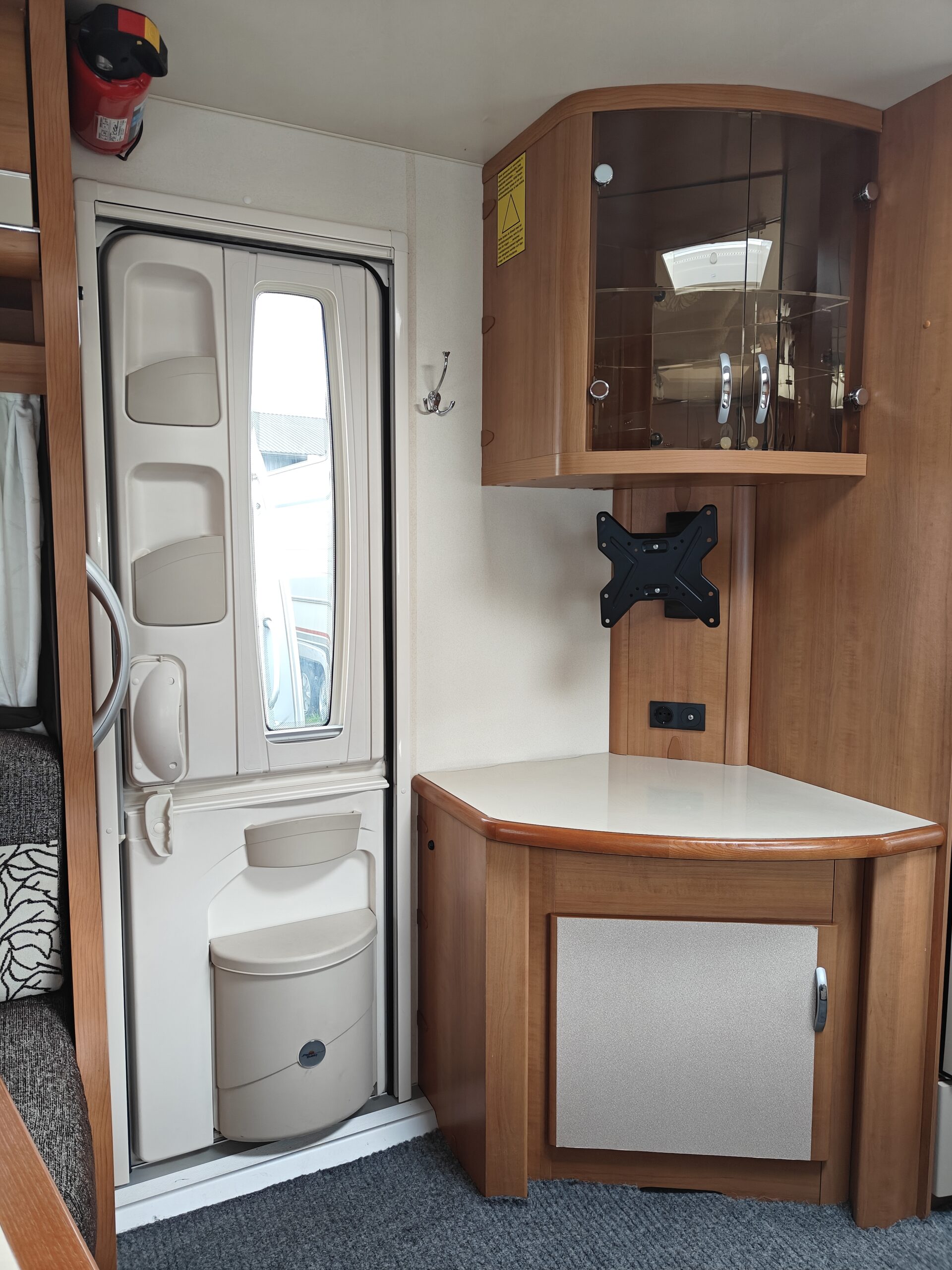 3-våningssängar, Alde vattenburen-centralvärme, elvärme, el-golvvärme, varmvatten, stor kyl-/frysskåp, gasol-ugn, spis, spisfläkt, fast vattentank, kasettrullgardin, takfönster, tv-antenn, batteri/laddare, tältservice, säkerhetskoppling, alufälgar, gasflaska, mm...