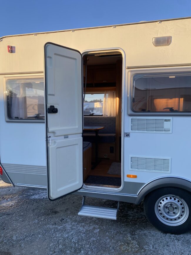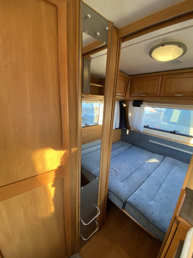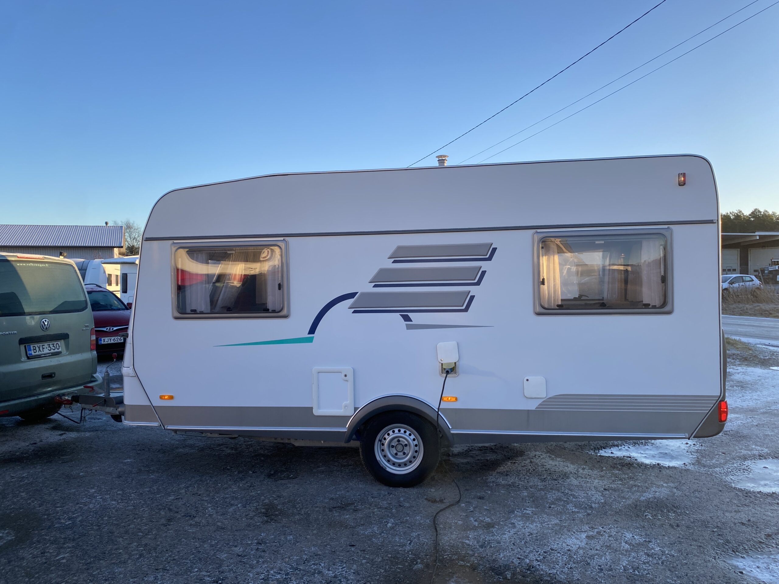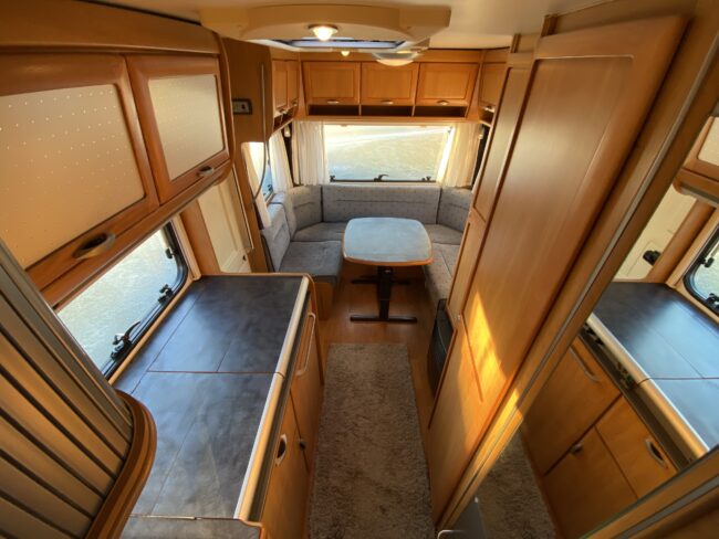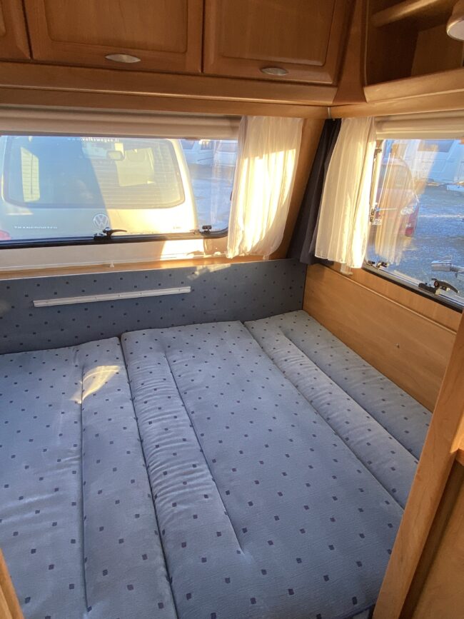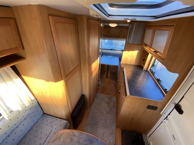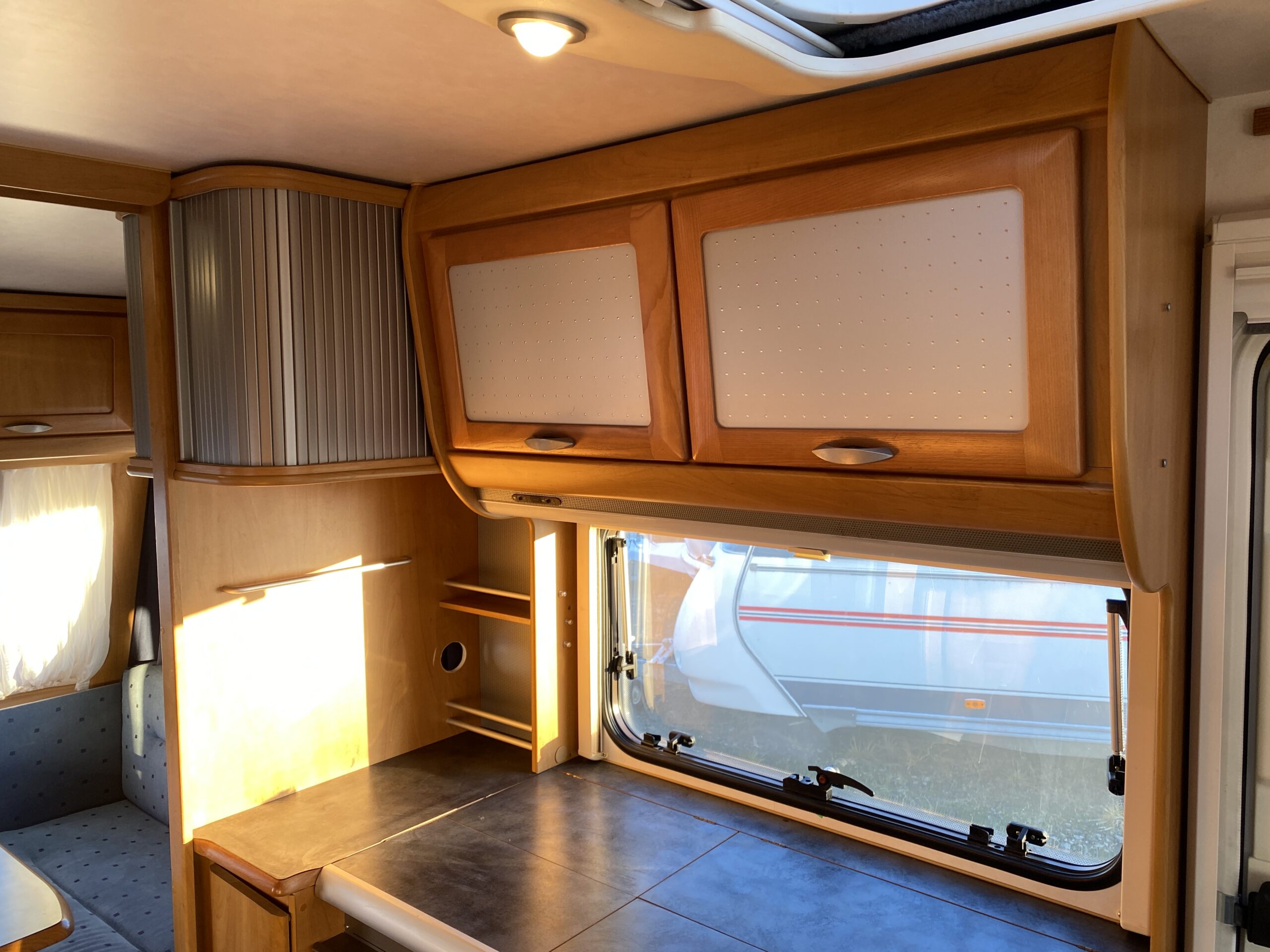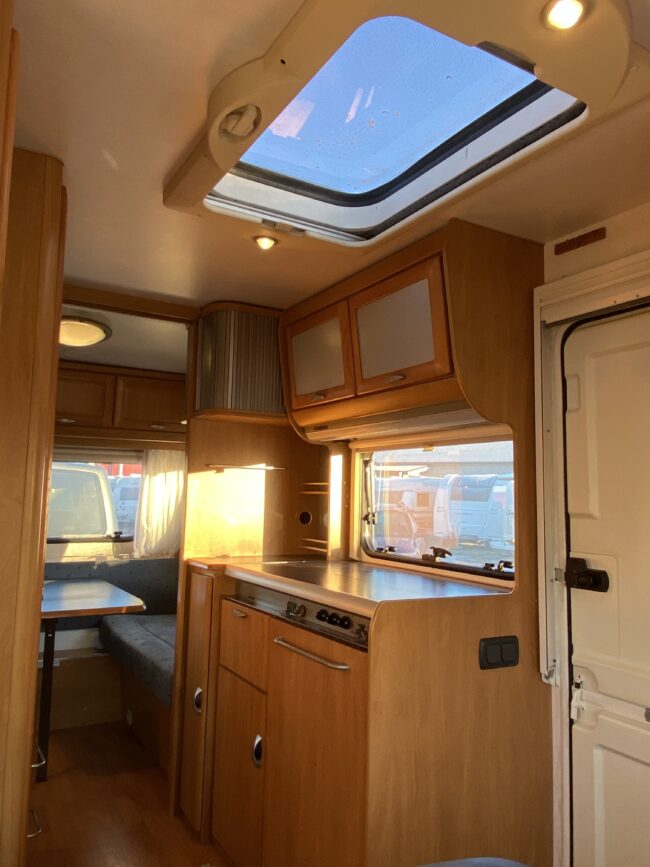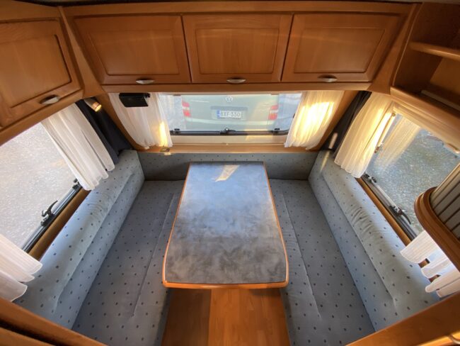 Truma-ilmakeskuslämmitys, lämmin vesi, jääkaappi, liesituuletin, kasetti-wc, kasettiverhot, iso kirkas-kattoluukku, akku-/laturivarustus, radio, caravankaapeli, peilit, varoituskolmio, raikasvesisäiliö, kitkavetopää, vararengas, tavaraluukku, sähkömittari, Integroitu porras,m kaasupullo....