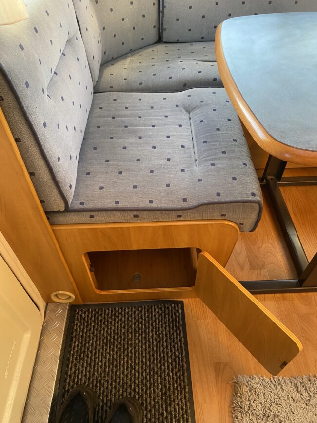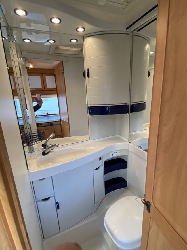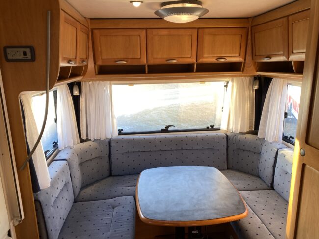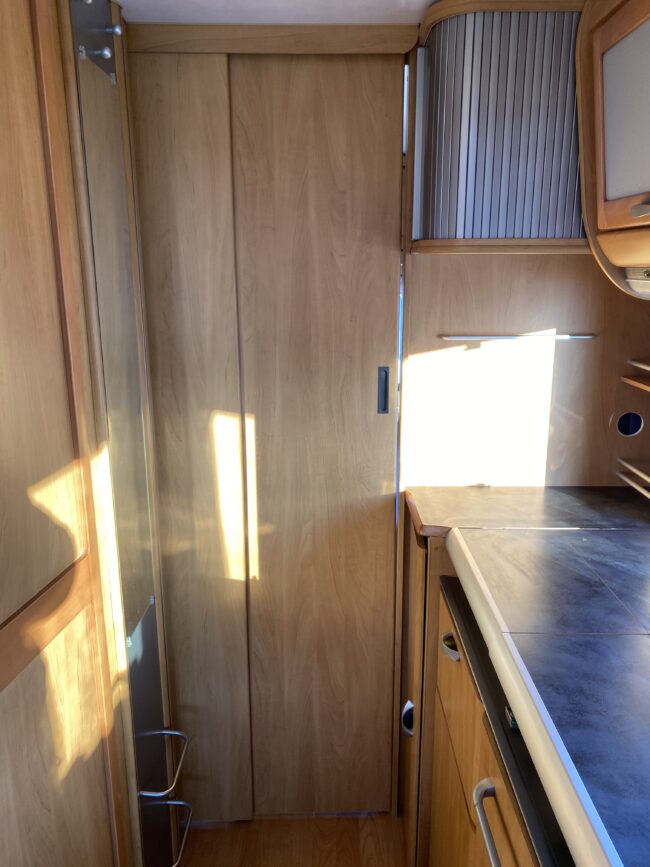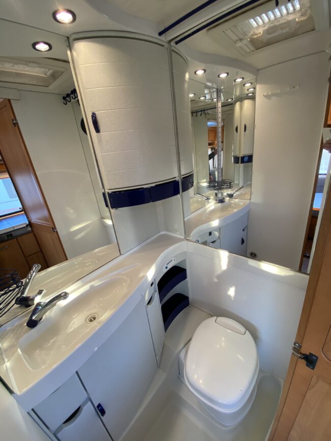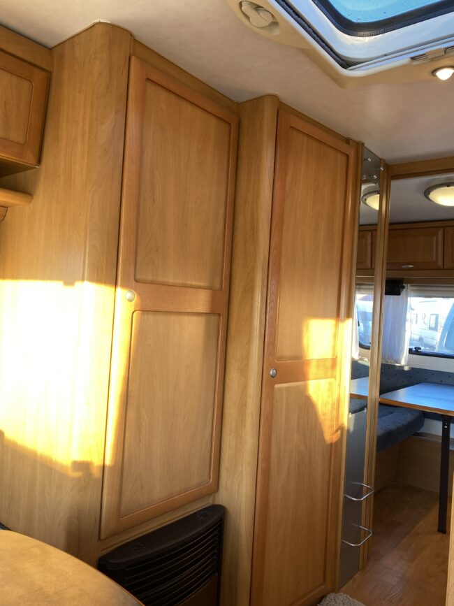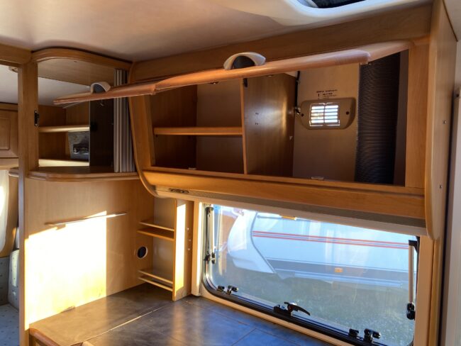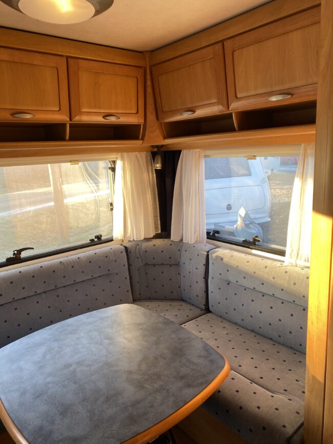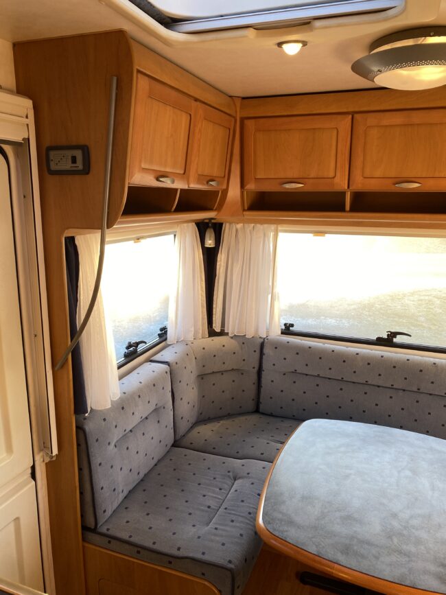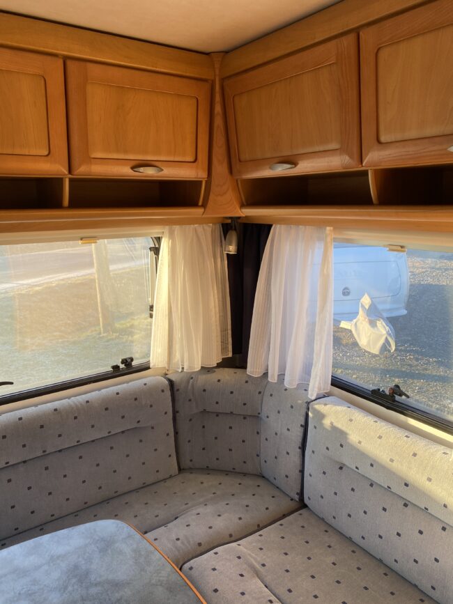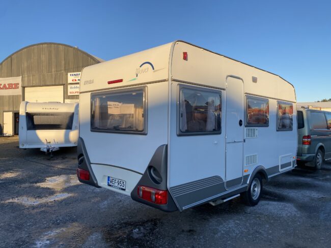 Truma-ilmakeskuslämmitys, lämmin vesi, jääkaappi, liesituuletin, kasetti-wc, kasettiverhot, iso kirkas-kattoluukku, akku-/laturivarustus, radio, caravankaapeli, peilit, varoituskolmio, raikasvesisäiliö, kitkavetopää, vararengas, tavaraluukku, sähkömittari, Integroitu porras,m kaasupullo....
