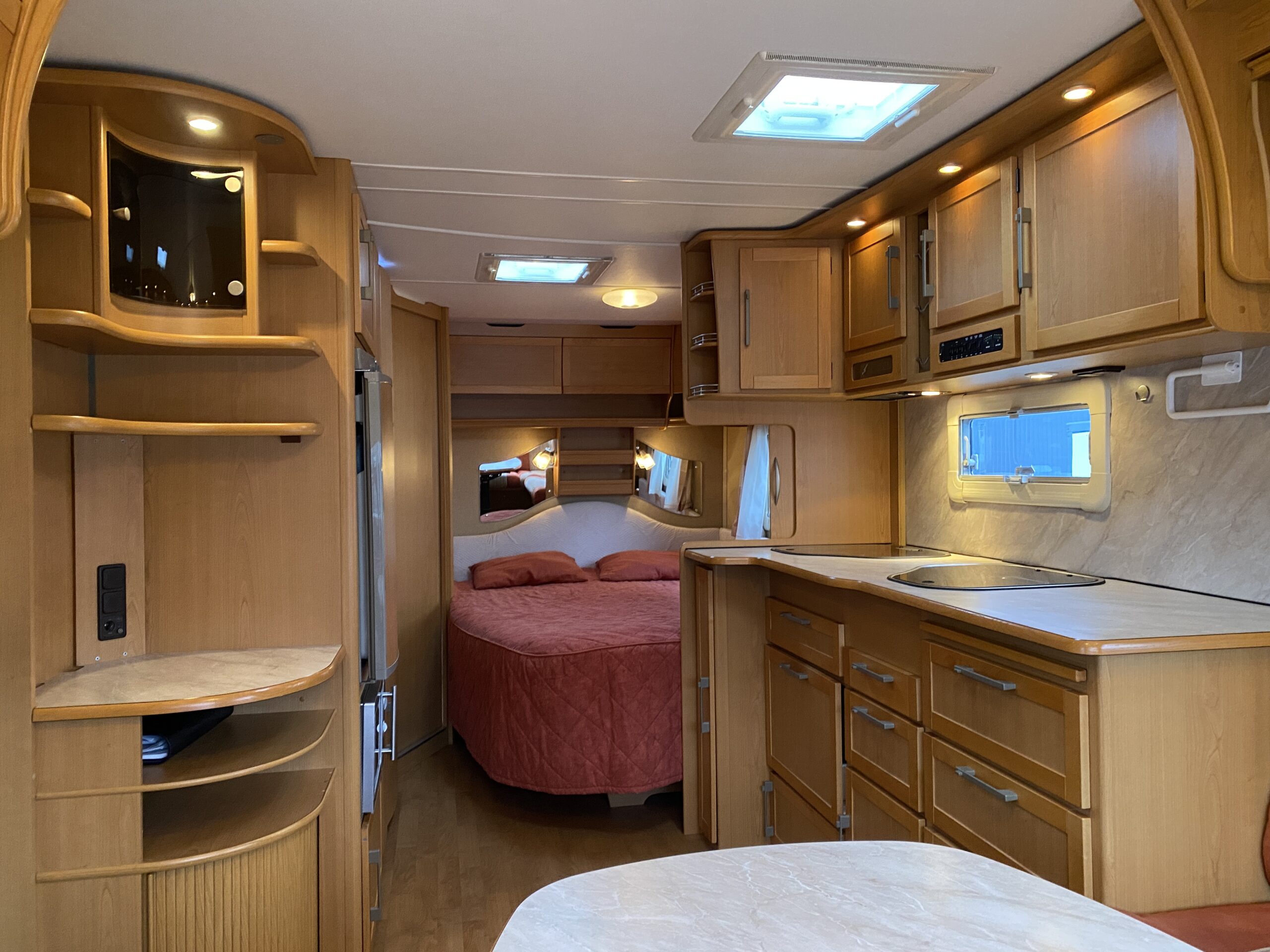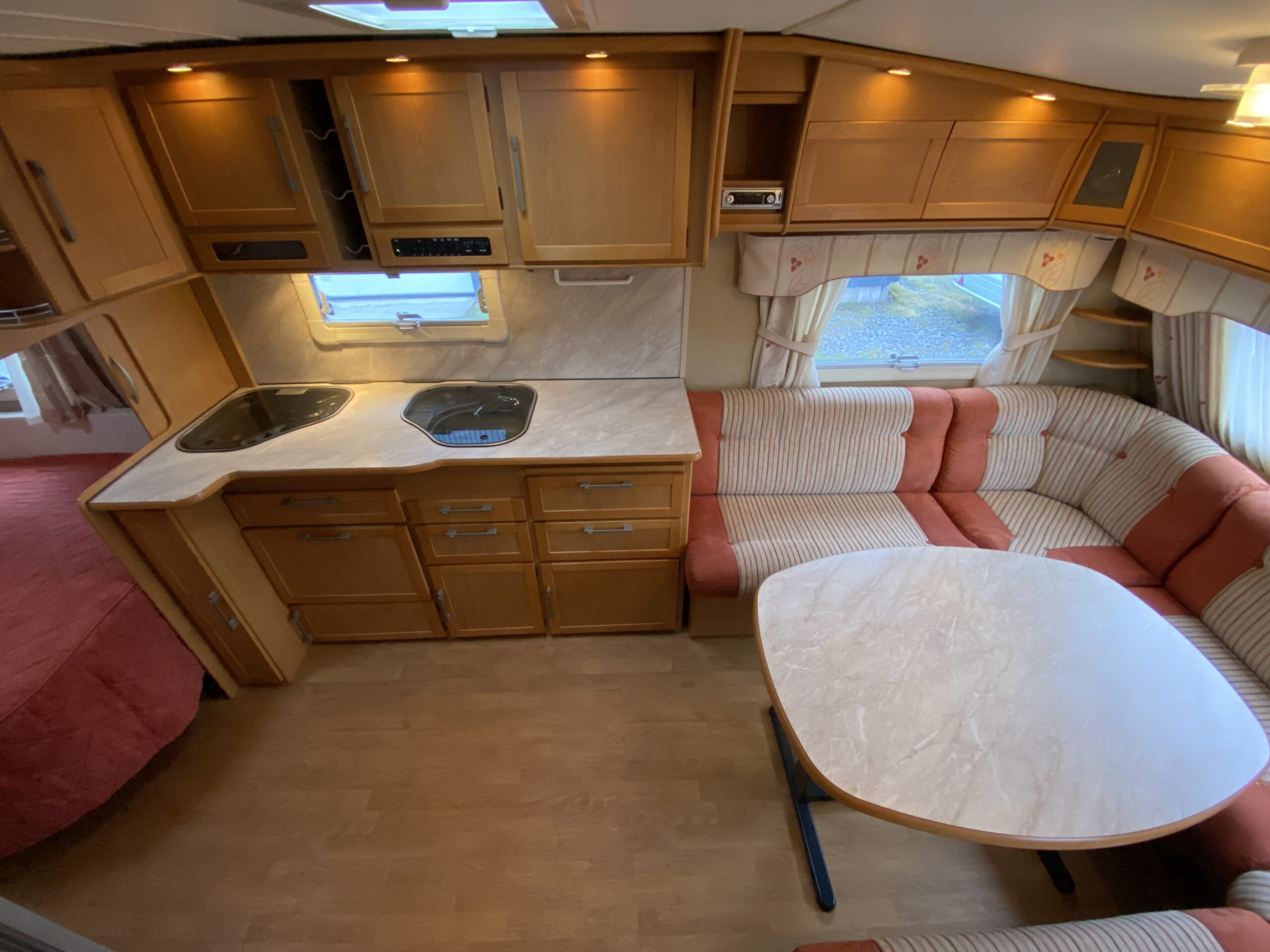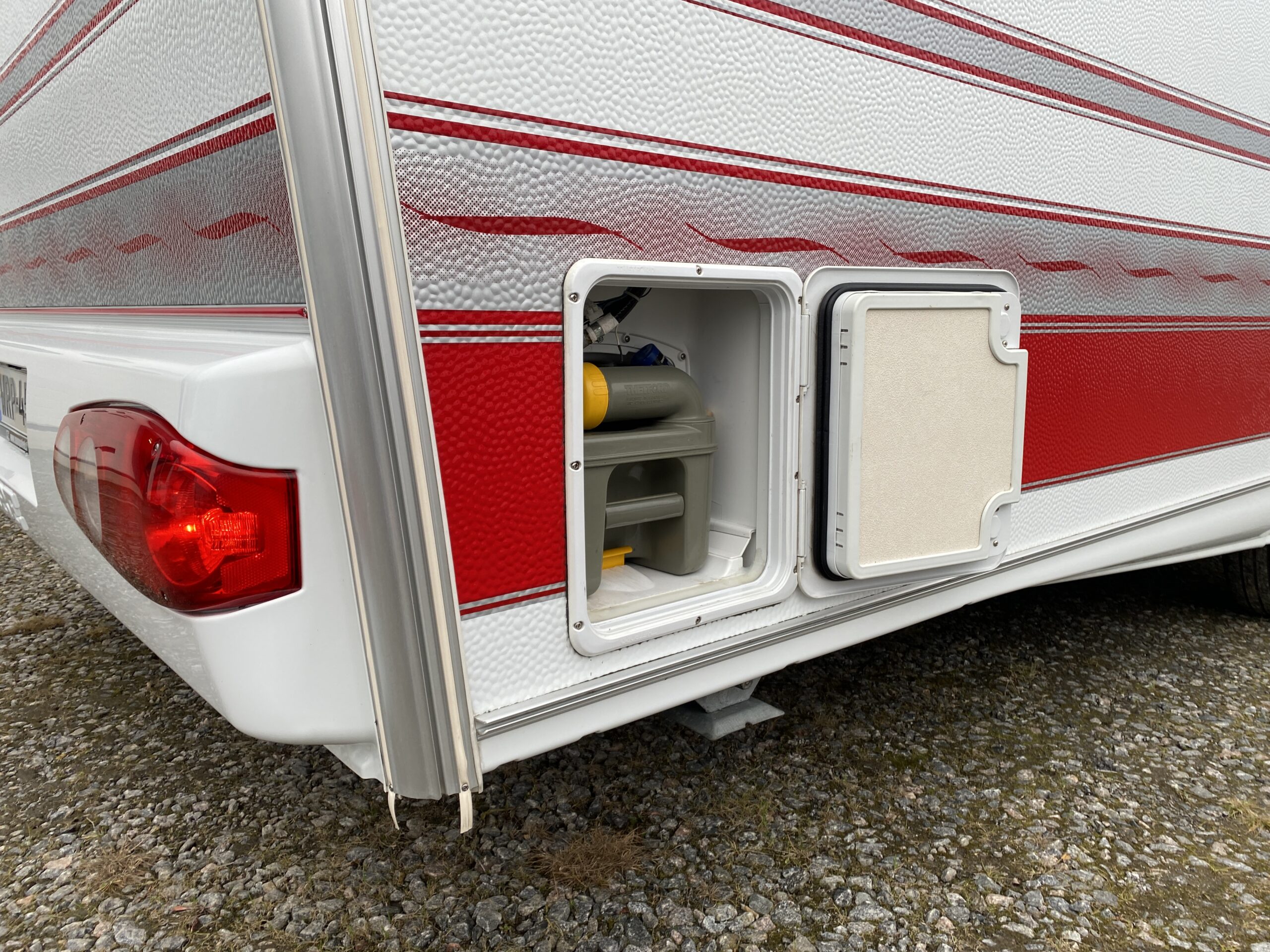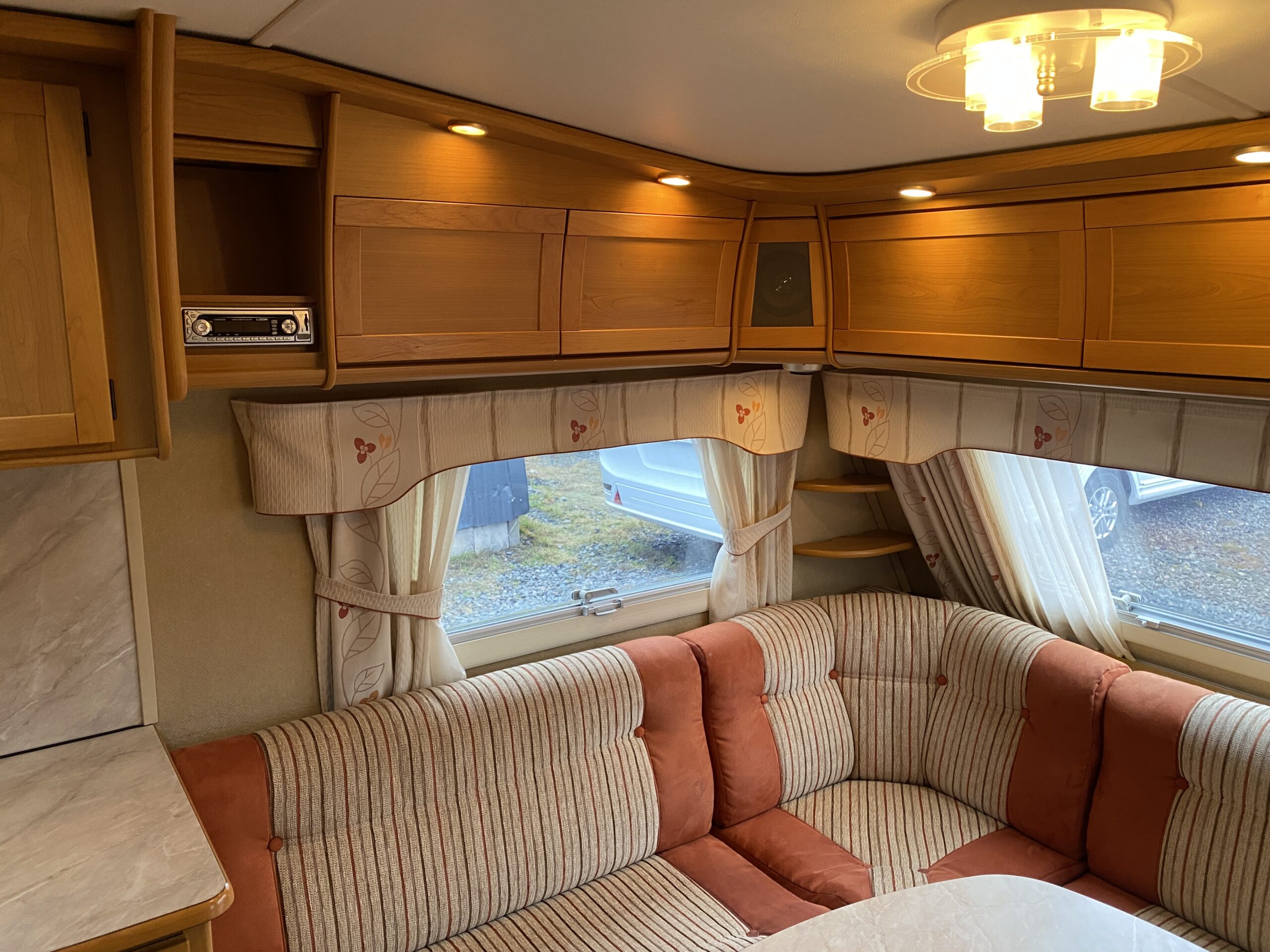 Alde vattenburen-centralvärme, elvärme, Alde-golvvärme, varmvatten, bide, spis, spisfläkt, kylskåp, mikro, fast vattentank, fast gråvattentank, kasettrullgardin, kasett-wc, tv-antenn, cd/radio, batteri/laddare, elmätare, tältservice, skibox, säkerhetskoppling, ventilationslucka, alu-fälgar, gasol-uttag,  gasflaska mm...