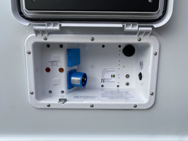 Sähkökeskus, jonka ulkopuolella on 230 V / 12 V-pistorasia