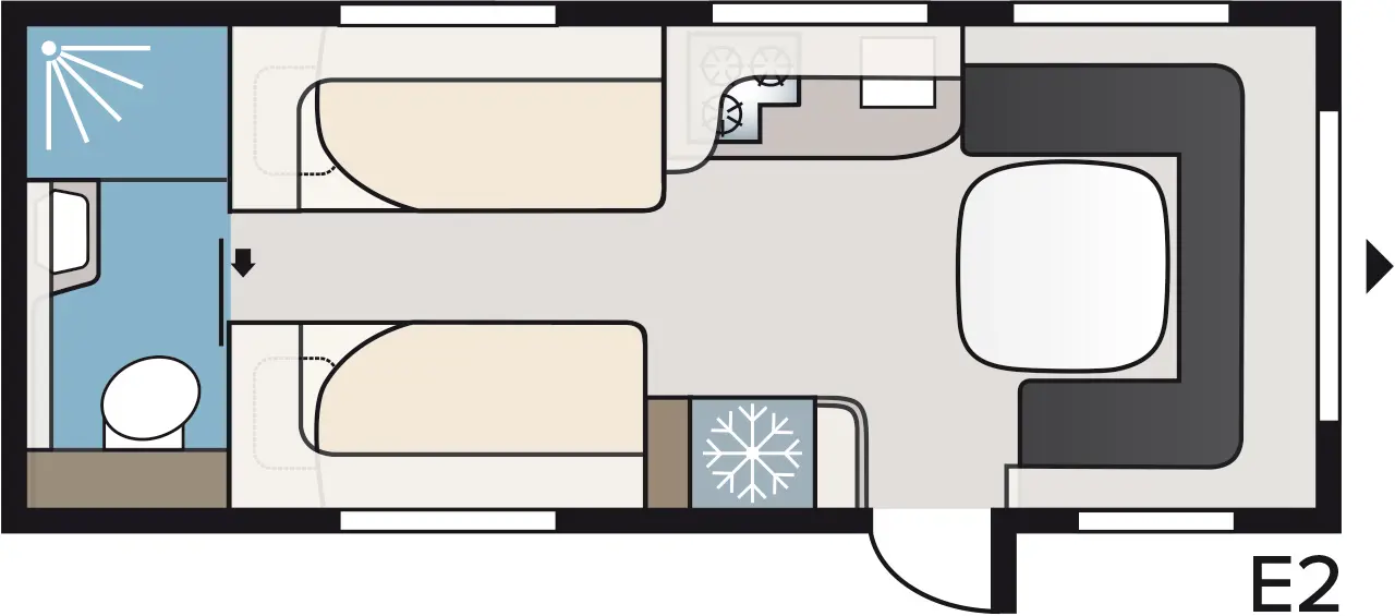 Vår minsta TDL-modell med två långbäddar. Badrum med duschkabin längs hela bakgaveln och ett kök med smart vinkelspis ingår också. En kompakt och flexibel enkelaxlad lösning för dig som vill resa lätt men ändå bo bekvämt.
